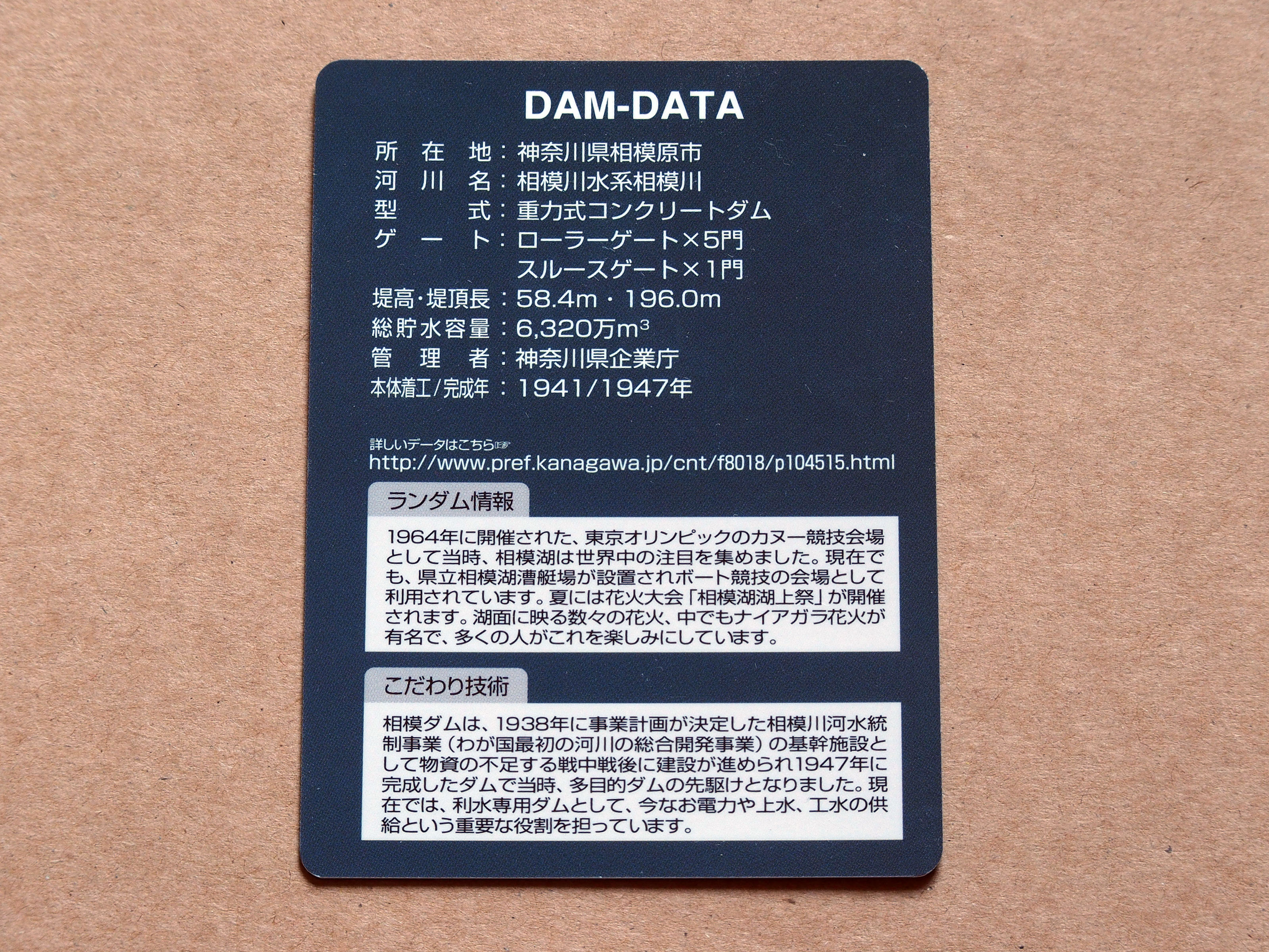 相模ダム ダムカード 2016/8/25 2017/10/25 ダムカード シェアする ツイート 相模ダム近くの相模ダム管理所と相模湖交流センターで配布。 相模ダム裏面。 完成から70年を迎えた2017年には記念カードが配布されている。